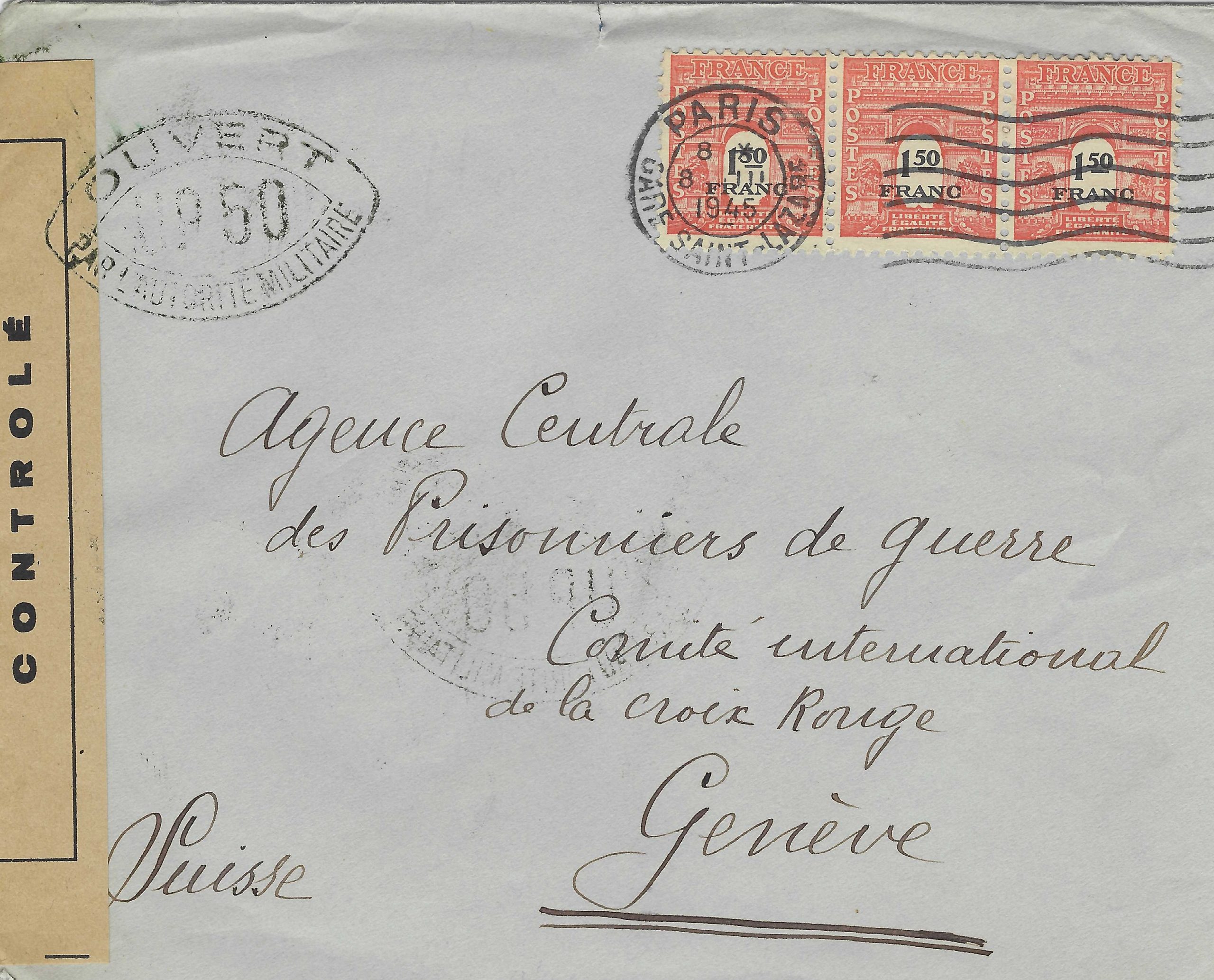 A cover from France is franked with a trio of 1.50-franc interim Arc de Triomphe stamps. It was postmarked in Paris on March 8, 1945. Censor tape closes one side and a rubber stamp shows it was opened and approved by the military authority.