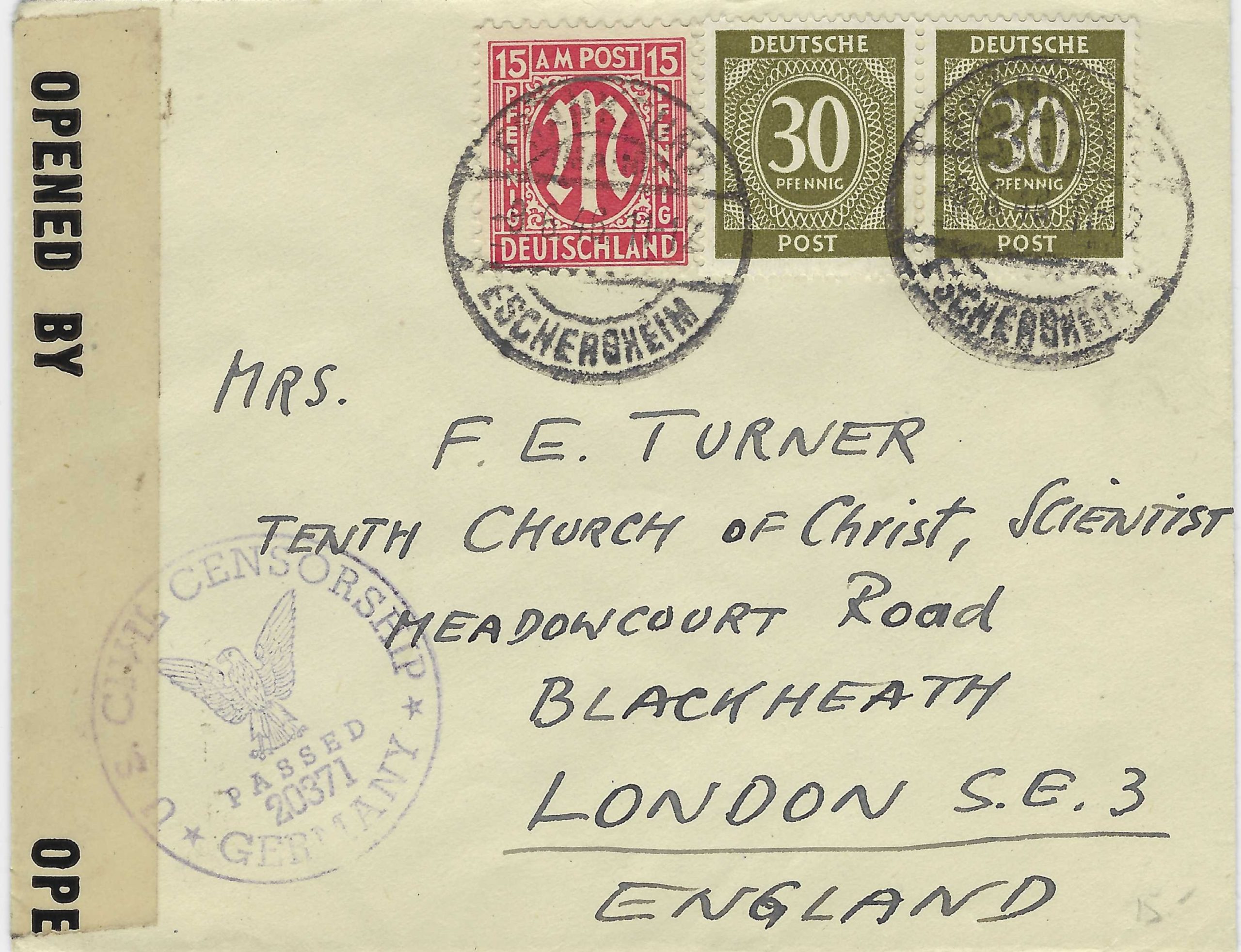 Many’s collection includes an example from Eschersheim, Germany, postmarked June 9, 1946, using both styles of AMG stamps that were available including two 30-pfennig stamps from the numeral series and a 15-pfennig stamp in the German “M” design. It, too, has censor tape sealing one side. A rubber stamp reading “U.S. CIVIL CENSORSHIP/GERMANY” indicates it passed inspection and was sent on to London.