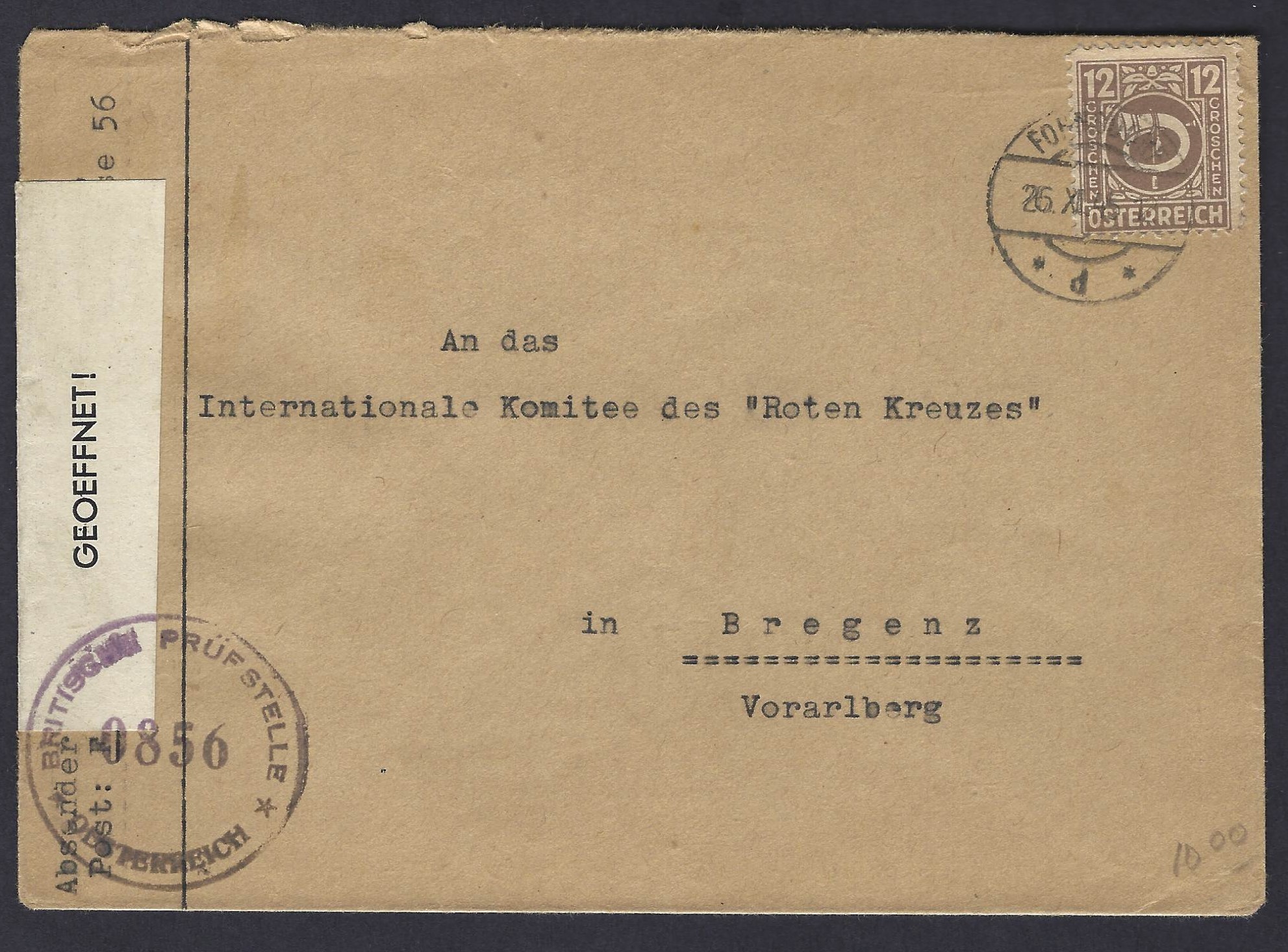 An example of mail from the period in Austria is franked with a pale buff brown 12-groschen stamp postmarked Nov. 26, 1945, in Fohnsdorf, Styria. It was sent to the International Committee of the Red Cross in the western city of Bregenz, Voralberg.