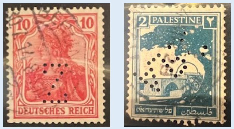 My main collecting interest is Holy Land material. Perfins have been used on postage stamps from around the world including Palestine. The term perfin is an acronym from the words “perforated” and “initial.” An S is generally added to make the word plural.