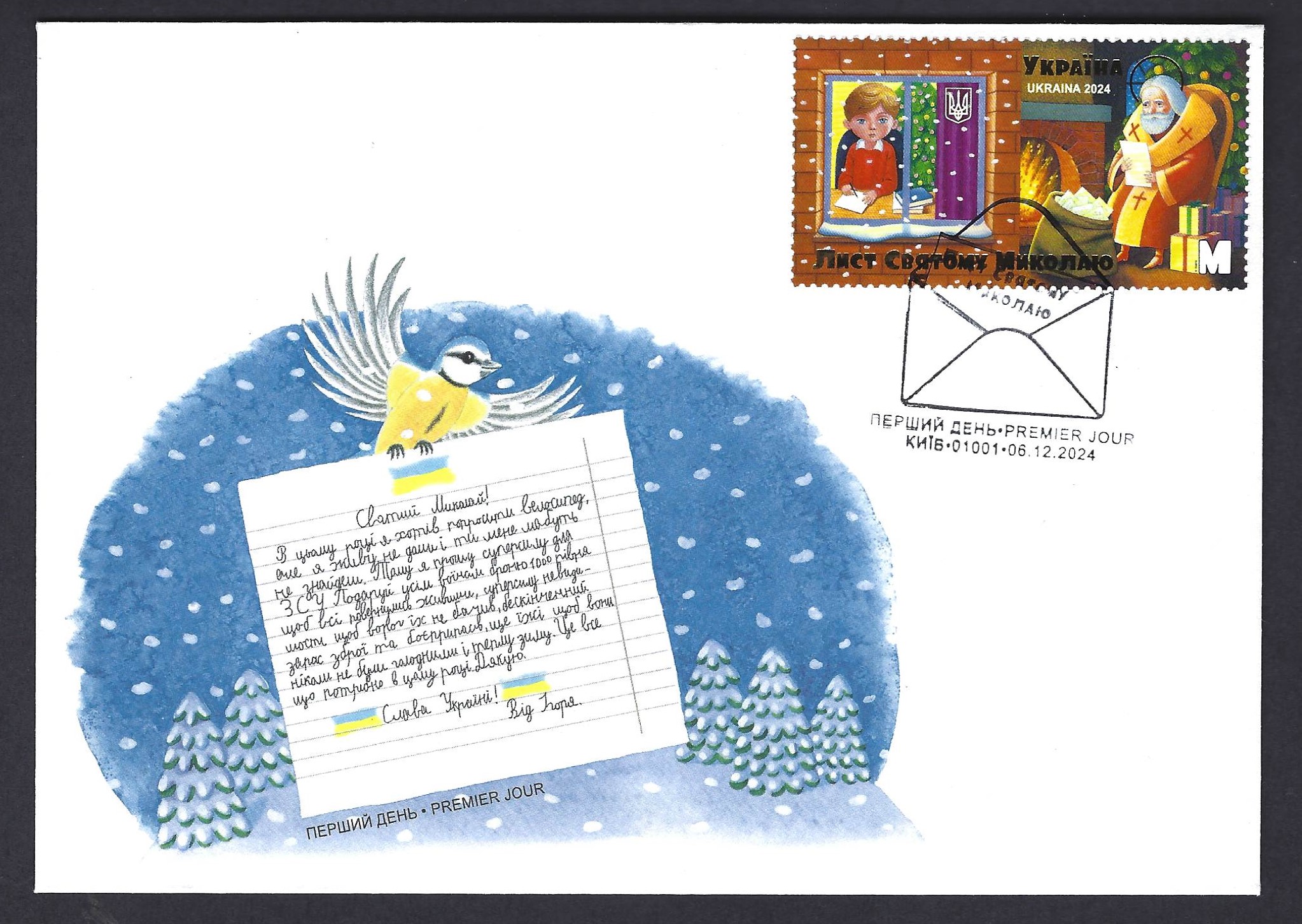 Text on the back developed by Ukrposhta explains that traditionally such a letter would tell of a child’s good deeds and include a request for toys or sweets. Since the war, however, the text continues, children “write about their painful experiences and ask for not just gifts, but for: ‘superpowers for the Armed Forces of Ukraine,’ ‘level 1000 armor,’ ‘a supply of weapons,’ ‘a warm winter’ for Ukrainian defenders and, most importantly, ‘that everyone comes back alive.'”